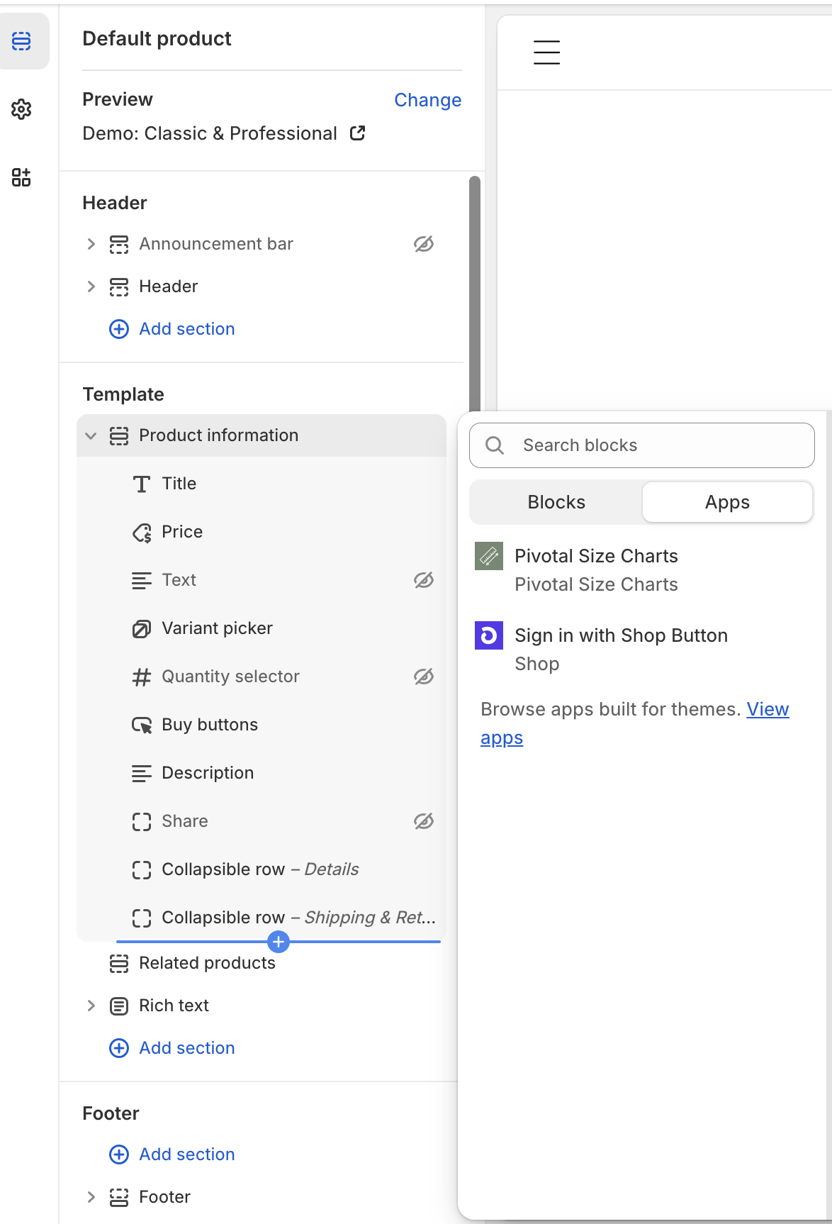 - Verify app block: Confirm the Pivotal Size Charts app block is added and enabled